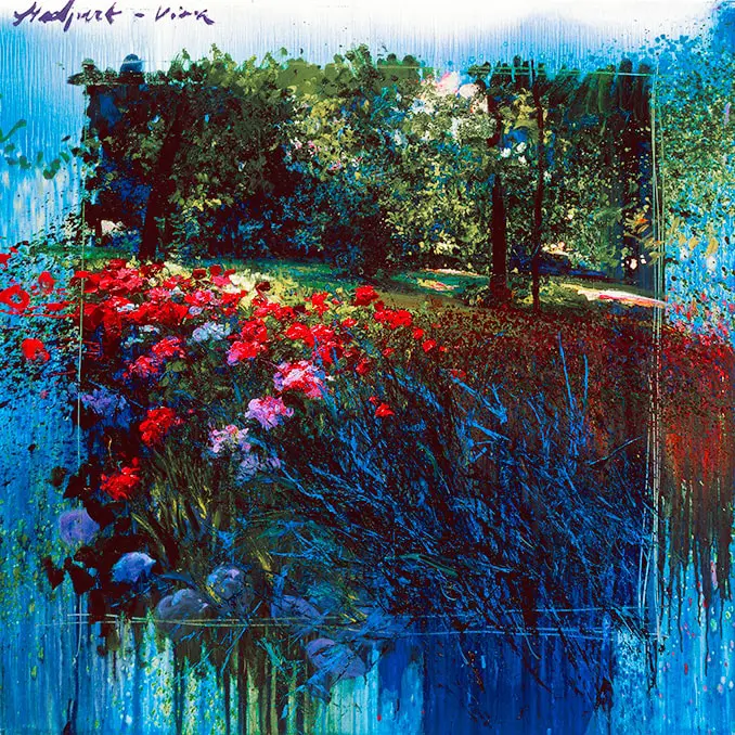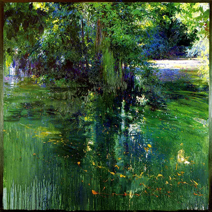 近接では、激しい筆遣いを残すダイナミックなタッチで滴り落ちて零れる色彩。